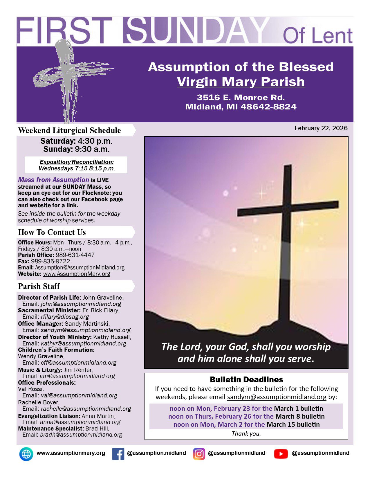 Submissions are due Monday at noon for the following Sunday’s bulletin. Please email submissions to Sandy Martinski, Office Manager.
